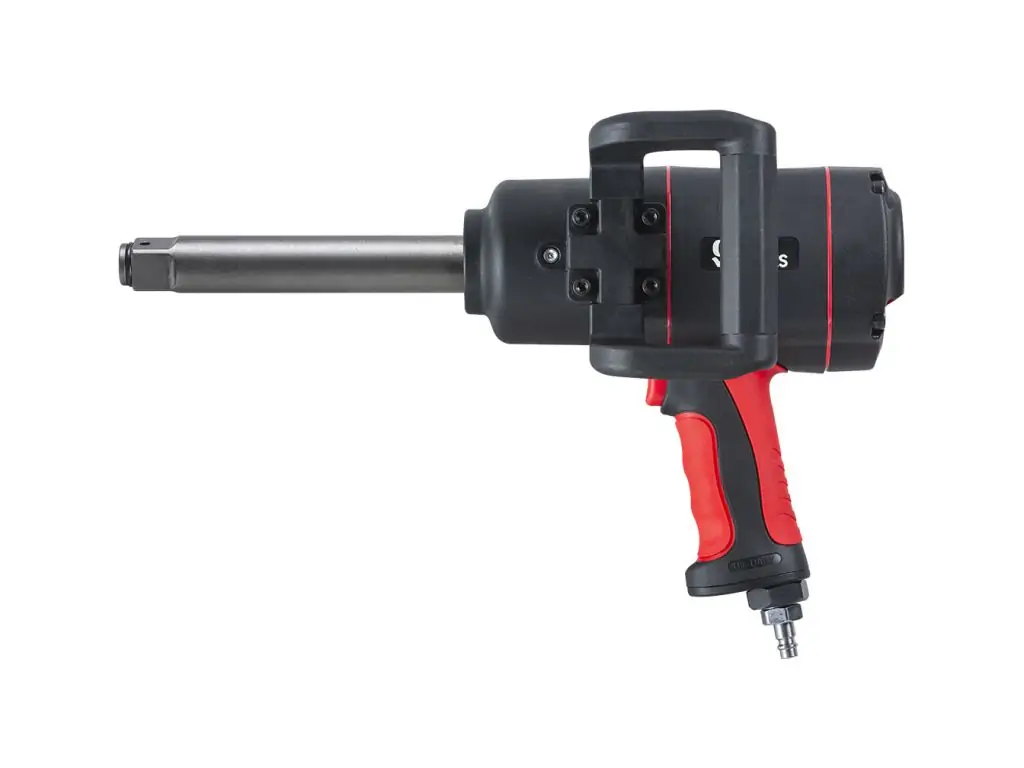 Модель имеет посадочный квадрат 1”, который рассчитан на большие крепления и высокие нагрузки. Удлиненный приводной вал из сверхпрочной хром-молибденовой стали позволяет работать с колесами, имеющими глубокие ободы, без использования дополнительных удлинителей. Интегрированный регулятор с функцией реверса имеет 3 режима затяжки и 1 режим откручивания. Отработанный воздух выходит через диффузор, направленный под углом. Для надежного контроля при работе этот тяжелый пневматический гайковерт имеет двуручную систему управления с дополнительной боковой ручкой. Композитные вставки защищают руки оператора от холодного ожога.