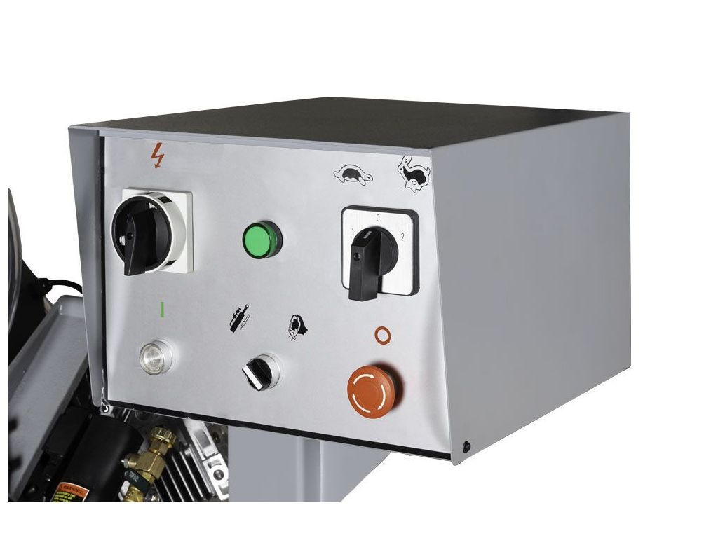 Данный станок оборудован двумя скоростными двигателями (две обмотки), регулировка происходит за счет переключения на пульте управления. Регулировка скорости в ленточных пилах по металлу является важной функцией, так как она оказывает непосредственное влияние на качество и скорость работы с заготовкой. Регулировка скорости позволяет оператору адаптировать скорость резания к конкретному материалу, непосредственно влияющему на эффективность и качество обработки. Подбор соответствующей скорости поможет избежать перегрева полотна или заготовки, что способствует более длительному сроку службы полотна и ожидаемому результату от работы, а также регулировка помогает избежать излишней вибрации.