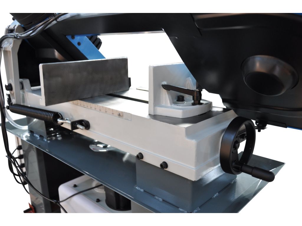 Способность резать под углами представляет собой незаменимую функцию станка, данная модель оборудована поворотными давлениями. Благодаря простоте конструкции имеет более доступную цену по сравнению с пилами с поворотной режущей головой. Используется на производствах, где производится рез как правило под прямым углом и иногда под другими углами.