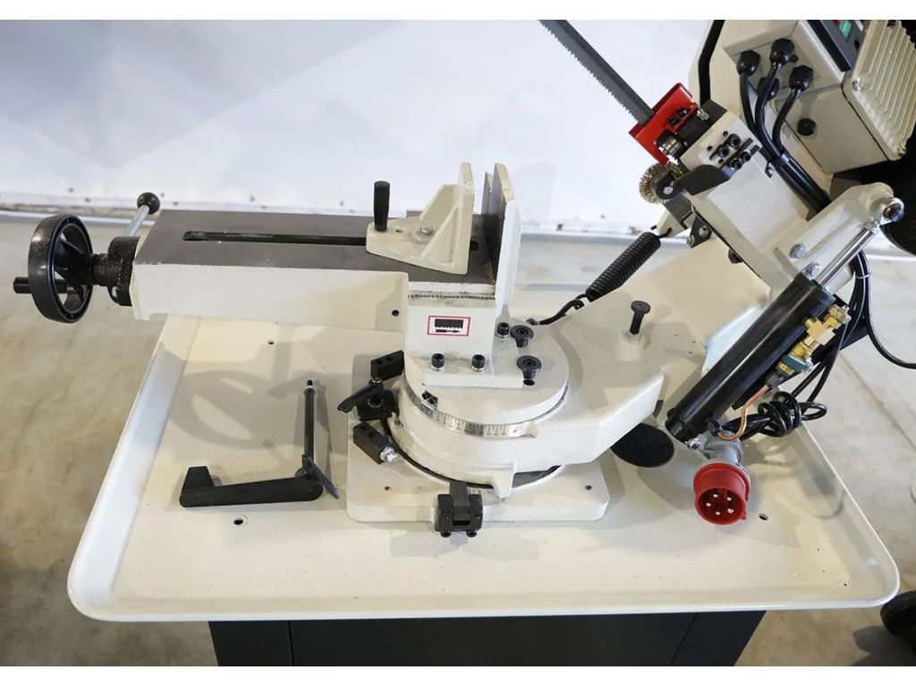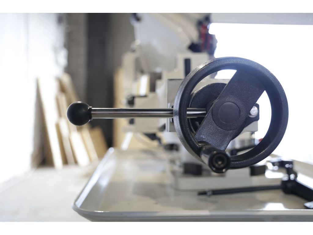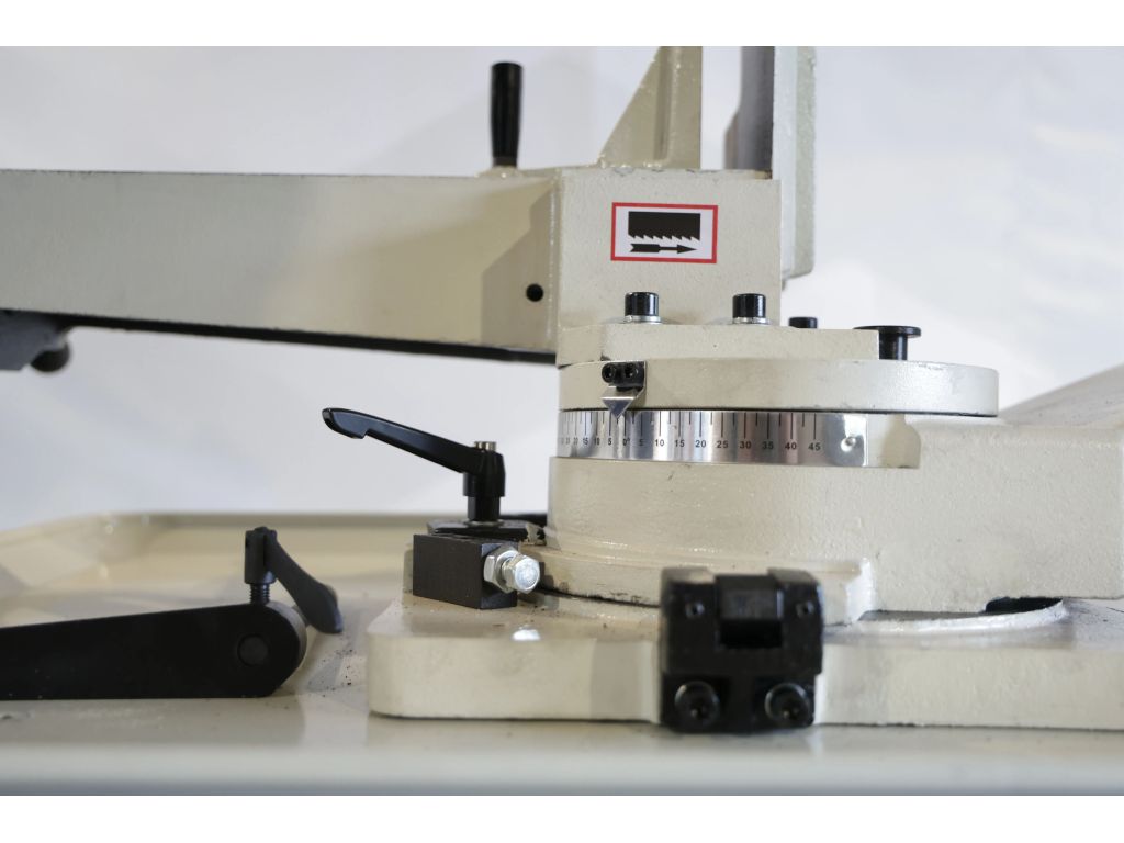Способность резать под углами представляет собой незаменимую функцию станка, данная модель оборудована поворотной головой. В отличие от станка с поворотными давлениями, на станке с поворотной режущей головой заготовку не нужно поворачивать вокруг станка. Это очень актуально для заготовок большой протяженности. Также поворотная голова позволяет добиться лучшей точности угла реза. Поворотную голову гармонично дополняет эксцентриковый зажим давлений, позволяющий после регулировки давлений быстро зафиксировать или отпустить заготовку без повторной регулировки, что увеличивает эффективность работы станка.