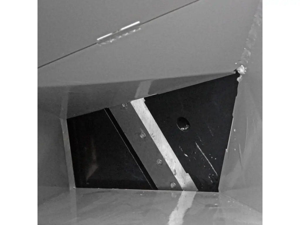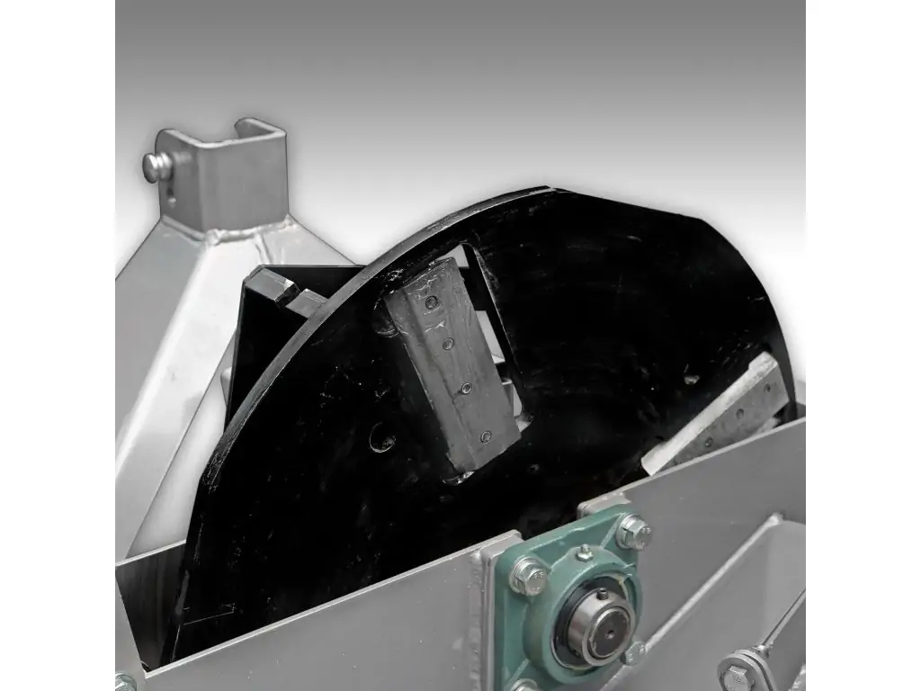 Агрегат сконструирован таким образом, чтобы его было удобно обслуживать: вы можете полностью открыть крышку маховика, открутив лишь один винт, открывающий доступ к 4 режущим ножам. Эти режущие лезвия двусторонние, так что их можно поворачивать, если нужно. Маховик имеет вес нетто 50 кг и оснащен крыльями, которые создают невероятно мощное всасывание, что в конечном итоге выталкивает стружку из желоба. Благодаря такому мощному всасыванию блокировка измельчительного устройства практически невозможна.