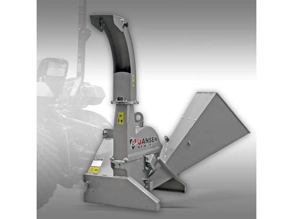 Желоб имеет высоту 152 см (плюс высота нижней тяги) и может вращаться на 360 градусов. По запросу мы также можем дополнительно поставить удлинитель желоба на 50 см. Это позволяет легко направлять щепу на тракторный прицеп или непосредственно в биг-бэги. Угол выброса также можно изменять. BX-42S может выбрасывать щепу на расстояние до 6 м.