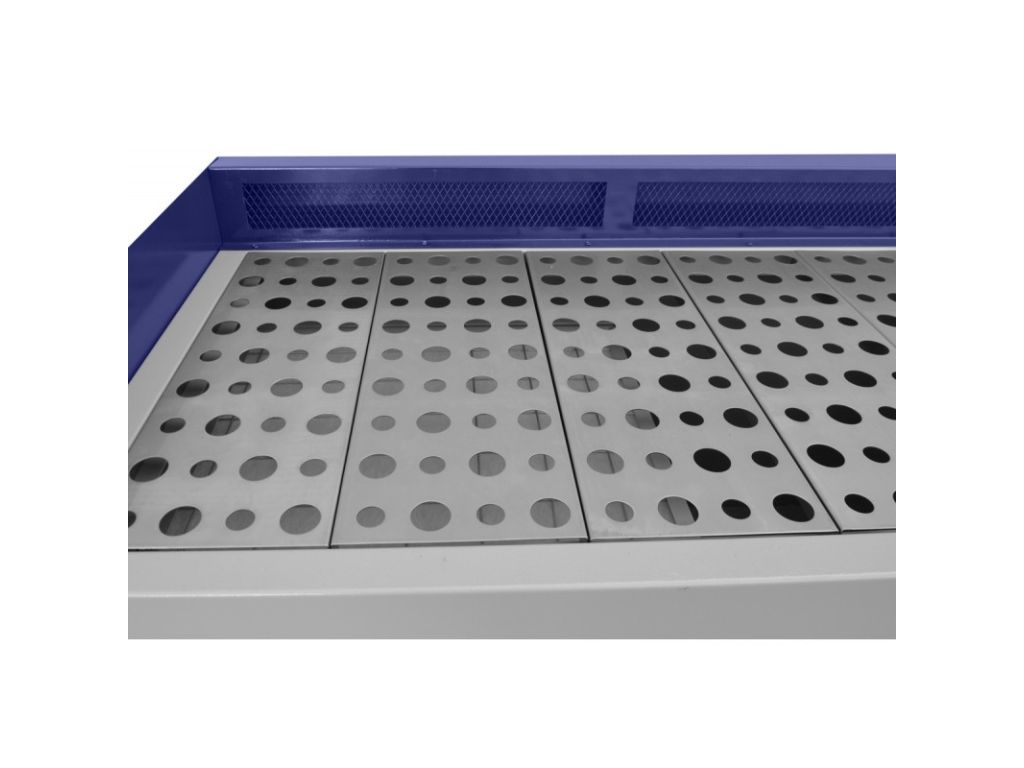 2 радиальных вентилятора, размещенных с обеих сторон стола, обеспечивают мощный поток воздуха и качественное и быстрое удаление пыли и стружки. Вытяжка производится через нижнюю часть стола и его боковую стенку. Столешница имеет размер 2060x530 мм и состоит из 11 отдельных сегментов, что облегчает позиционирование заготовок и очистку механизмов и фильтров. С обеих сторон стола находятся металлические резервуары для сбора отходов. Этот вытяжной стол для шлифовки разработан для интенсивной эксплуатации, поэтому отлично подойдет для профессиональных мастерских и производств.
