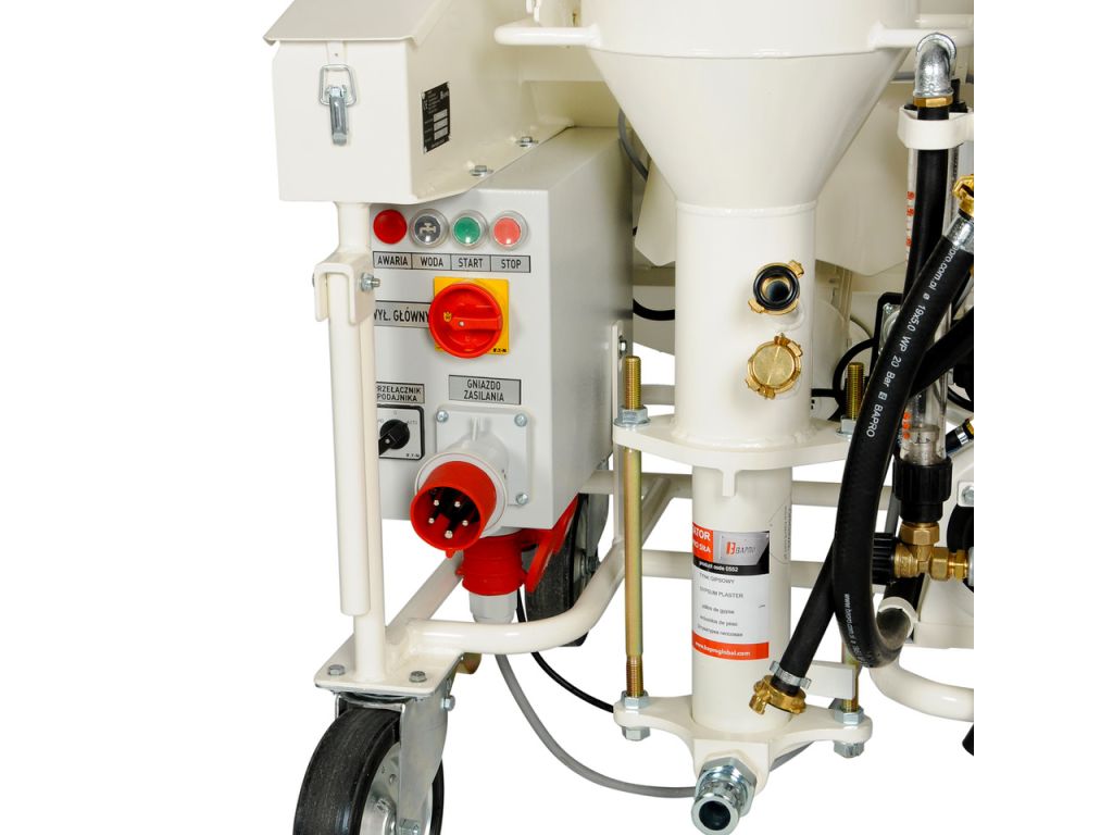 Станция оснащена двумя трехфазными асинхронными двигателями. Мощность главного двигателя составляет 5,5 кВт (416 об/мин), двигателя шнека – 0,55 кВт (29 об/мин). Высокий запас мощности позволяет эффективно работать с тяжелыми, густыми и абразивными растворами. Скорость вращения главного двигателя плавно регулируется инвертором, что позволяет регулировать производительность подачи от 4 до 8 л/мин и экономить электроэнергию. Раствор наносится с помощью сжатого воздуха от трехфазного безмасляного компрессора с производительностью 250 л/мин. Эта станция для нанесения штукатурки промышленная оборудована электронной системой управления и защиты, что обеспечивает стабильную работу, высокое качество растворов и нанесения и долговечность оборудования. Еще одним весомым преимуществом представленной модели является возможность интеграции с пневматическими системами подачи сухой смеси из силоса, что позволяет обеспечить непрерывность, максимальную производительность и скорость работы.