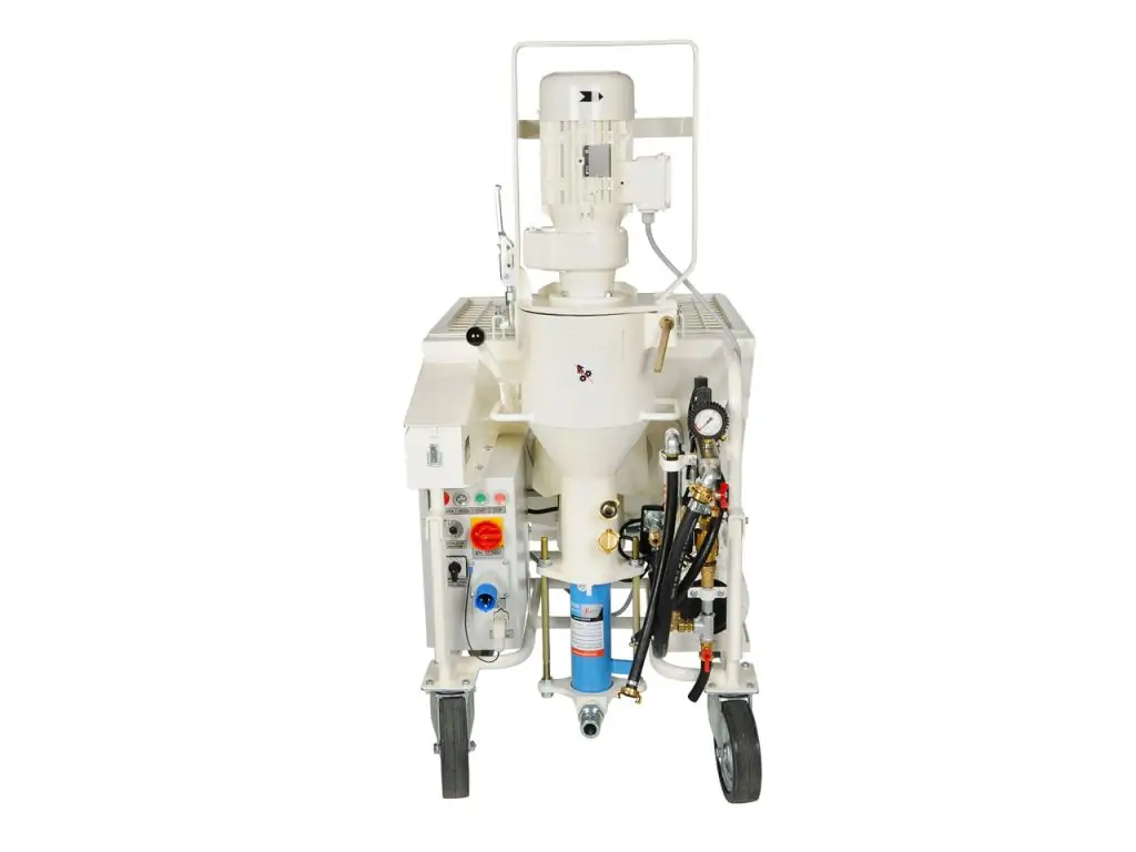 Готовый раствор подается с помощью шнекового насоса (ротора и статора) и транспортного шланга, а наносится на поверхность с помощью сжатого воздуха. Длина подачи составляет 30 м, что позволяет обслуживать большие площади без перемещения станции. Эта штукатурная станция 230 В профессиональная оснащена 4 вращающимися резиновыми колесами, обеспечивающими плавное движение даже по неровным поверхностям.