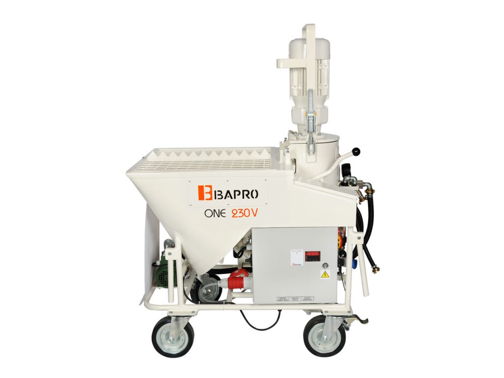 Штукатурная станция BAPRO one 230V – это универсальный смесительно-насосный агрегат, предназначенный для нанесения раствора на стену (гипс, цемент-известь, декоративные штукатурки, адгезионные и армирующие растворы и т.п). Оснащена трехфазным главным двигателем мощностью 5,5 кВт и отдельным трехфазным двигателем шнека смешивания мощностью 0,55 кВт. Важным преимуществом представленной модели является возможность подключения к разным типам электросетей (230 В и 400 В) благодаря встроенному инвертору, что позволяет использовать ее на объектах разного типа. Также инвертор плавно регулирует обороты главного двигателя при работе на разных режимах или с материалами разной плотности.