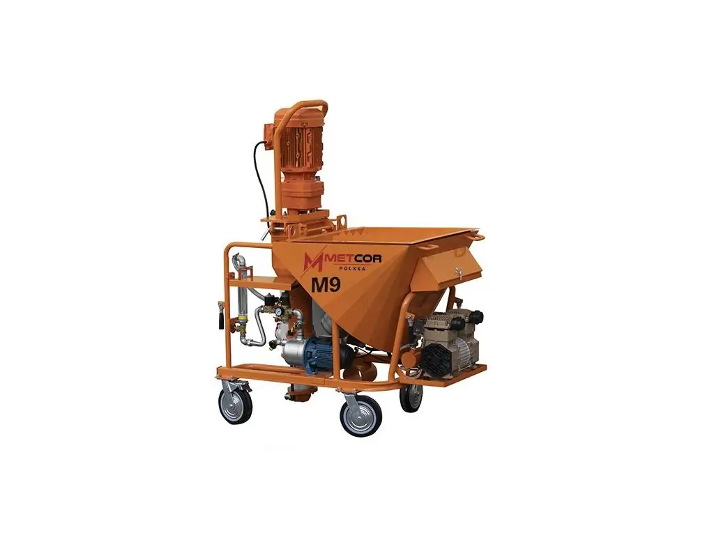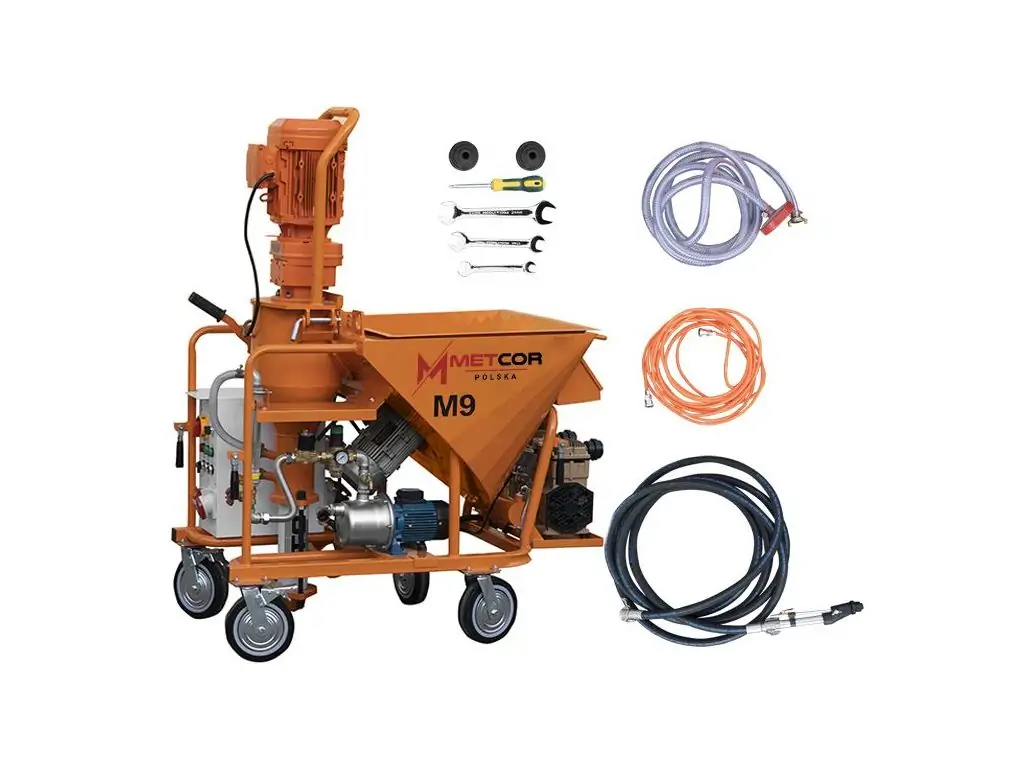 Штукатурная станция METCOR M9 – это профессиональное оборудование для автоматического приготовления, подачи и распила на поверхности гипсовых и цементно-известковых штукатурок, клеевых смесей, самовыравнивающихся стяжек и подобных строительных растворов. Трехфазный электродвигатель мощностью 5,5 кВт устойчив к перегреву и обеспечивает равномерное перемешивание тяжелых растворов и их непрерывную подачу к соплу. Для подачи готового раствора используется компрессор мощностью 1 кВт. Производительность станции составляет 30 л/мин при максимальном давлении 30 Бар. Максимальное расстояние подачи – 30 м по горизонтали и 20 м по вертикали.