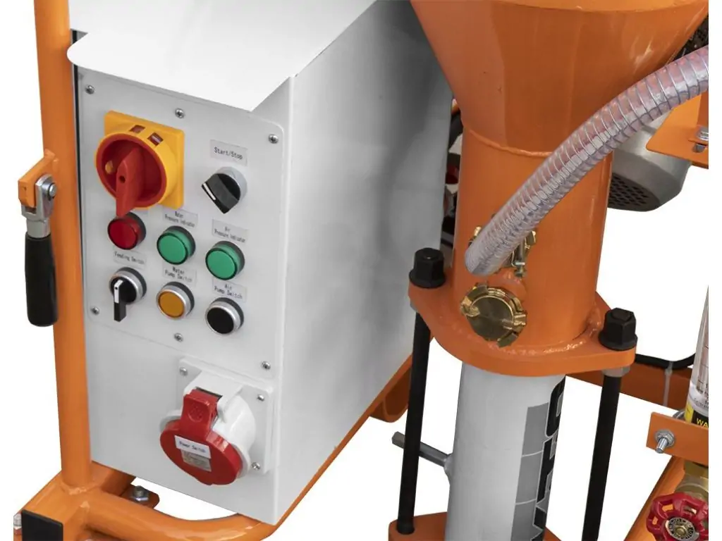 Система регулировки потока воды с ротаметром позволяет точно дозировать воду для правильных пропорций раствора. Объем резервуара для смесей составляет 100 л, что обеспечивает длительную работу без вынужденных остановок. Лопасти специальной формы эффективно разбивают комки, что гарантирует равномерность раствора. Благодаря простой панели управления и модульной конструкции с поворотными колесами и тормозами, эта строительная штукатурная машина удобная в эксплуатации и обслуживании.