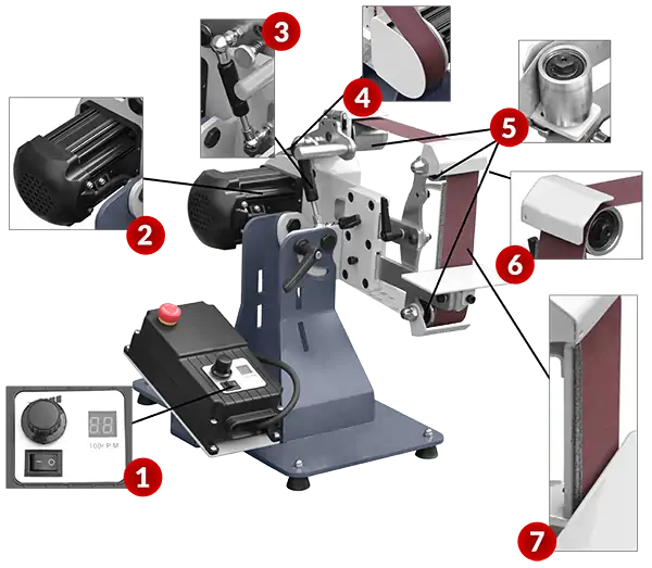 - Плавная регулировка скорости шлифовальной ленты в диапазоне 12-34 м/с