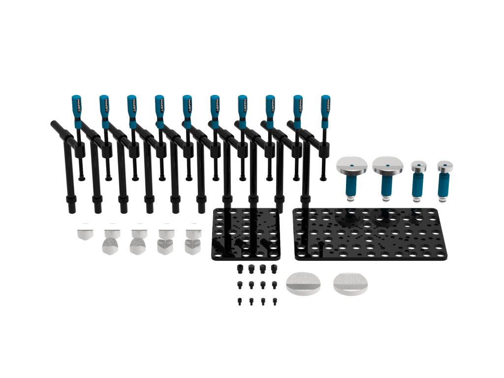 Набор COMPACT — это практичное решение для небольших производств и мастерских, которым нужен прочный, но компактный набор инструментов для сварки труб. Он предлагает базовый, но функциональный комплект креплений и призм, обеспечивающий эффективное позиционирование компонентов на столе.