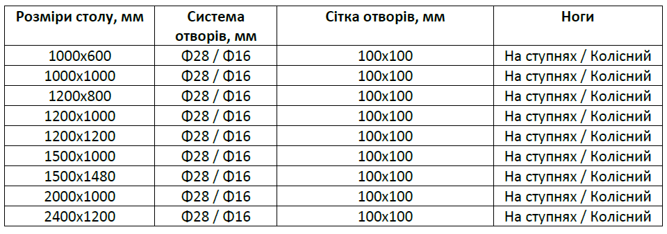 Поверхность стола имеет фрезерованные, скошенные отверстия с допуском размера ±0,05 мм, что облегчает монтаж и демонтаж инструментов. Гравированная шкала с диагональной сеткой 100х100 мм позволяет максимально точно позиционировать деталь. Ножки с профилем 60x60x4 мм обеспечивают устойчивость и стабильность стола, грузоподъемность – 250 кг на ножку. Вы можете заказать этот сварочный монтажный стол 12 мм с ножками на колесах или со ступнями.