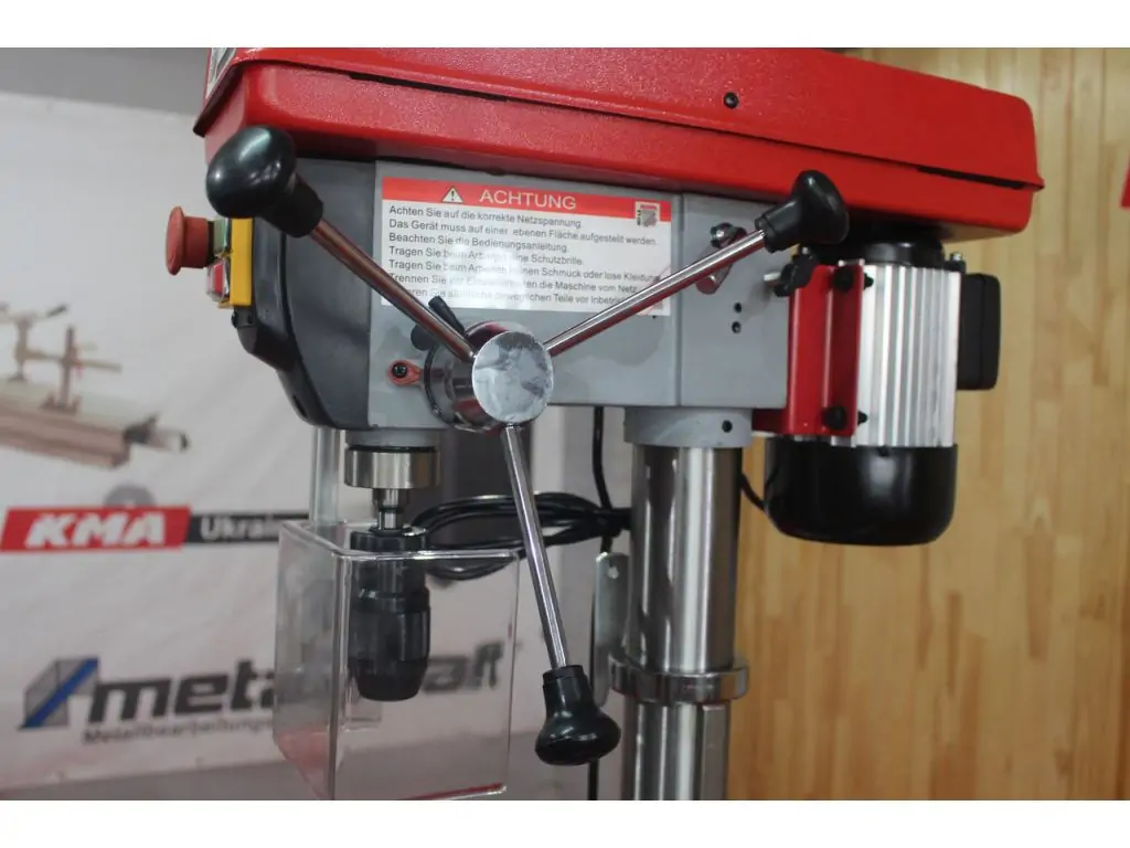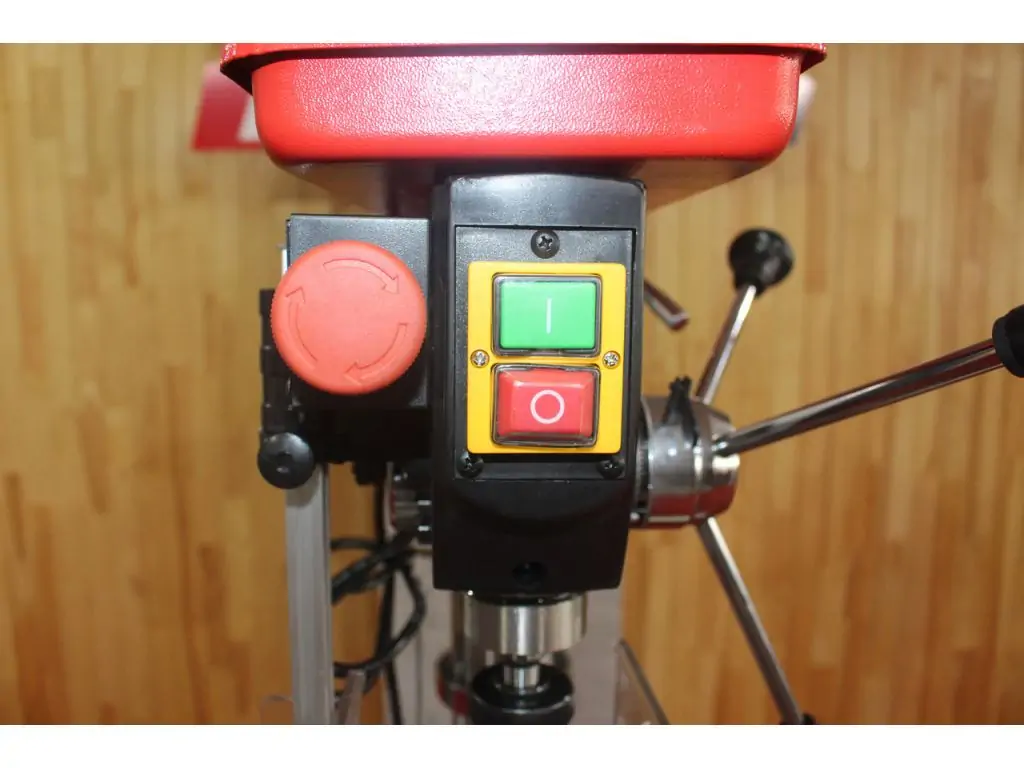 Скорость вращения шпинделя регулируется на 12 шагов в диапазоне 180-2740 об/мин. Регулировка скорости осуществляется перебрасыванием ремня. Стол станка выполнен из чугуна, имеет поворот на 360° вокруг колонны и регулируется по высоте с помощью зубчатой рейки. Для обработки больших деталей стол можно отвести в сторону и в качестве опоры использовать основание. Контроль процесса обработки обеспечивают трехплечий рычаг со шкалой глубины сверления и ограничитель глубины сверления. Этот настольный станок для сверления соответствует европейским стандартам качества и безопасности, что подтверждает сертификат СЕ.