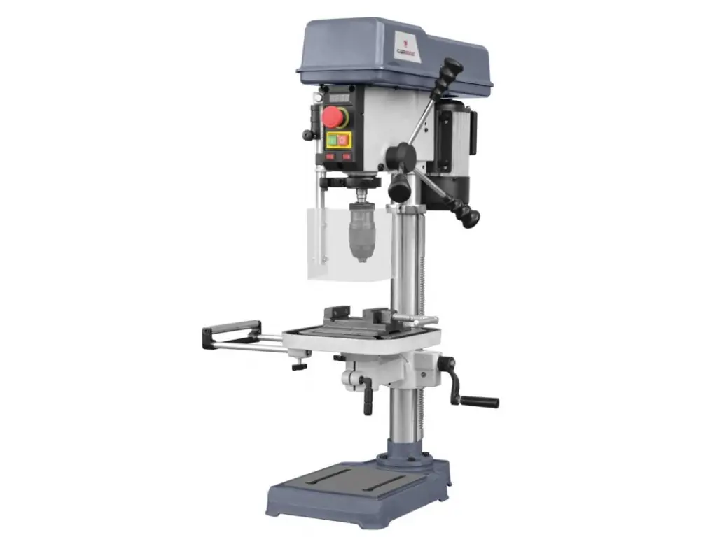 Рабочий стол регулируется по высоте и имеет наклон под углом до 45° в обе стороны, что позволяет производить широкий диапазон обработки. Быстрозажимной патрон дает возможность заменить рабочий инструмент в течение нескольких секунд. Для удобства работы станок оснащен подсветкой рабочей зоны, которая включается нажатием кнопки. Этот станок для сверления металла отлично подойдет для профильных мастерских и учебных заведений, а также для небольших производств.