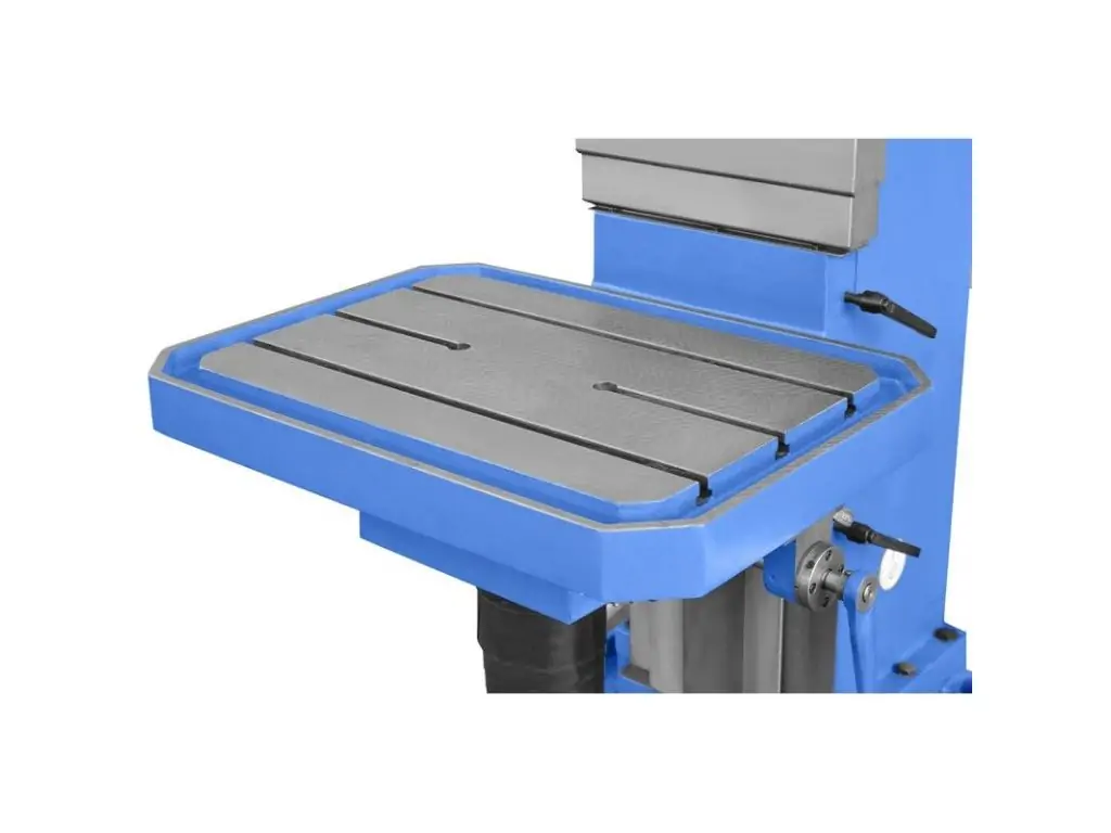 Станок оборудован системами безопасности в соответствии с европейскими нормами. Кнопка аварийного выключения с самоблокировкой для остановки станка при опасных ситуациях. Откидная крышка шпинделя защищающая оператора, при поднятой крышке станок не запустится. На рабочем столе есть Т-образные пазы, помогающие зафиксировать деталь или позволяющие установить дополнительные фиксирующие элементы, такие как тиски.