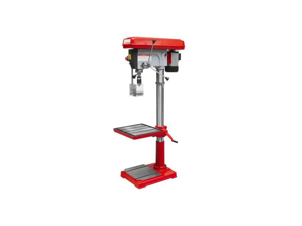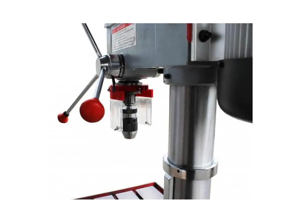 Рабочий стол регулируется по высоте, имеет наклон до 45° в обе стороны и вращается вокруг колонны на 360°, что обеспечивает удобство позиционирования заготовки, сверление под углом без дополнительных приспособлений и универсальность обработки разных форм. Жесткая колонна с полированной поверхностью гарантирует точное движение шпинделя без перекосов, а литое чугунное основание делает этот напольный сверлильный станок устойчивым к вибрациям и колебаниям.
