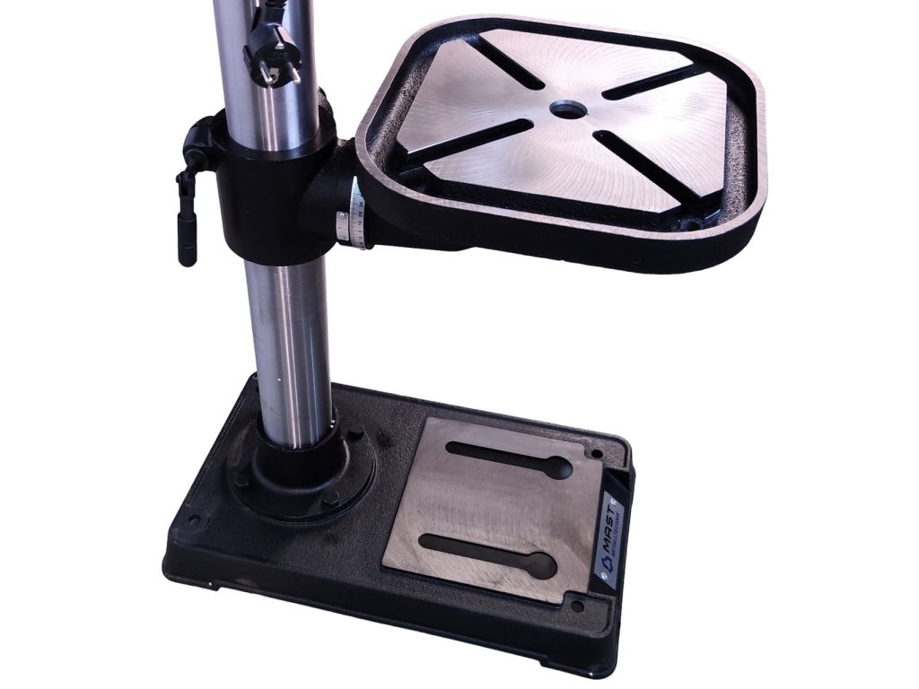 Основание, стол и сверлильная голова изготовлены из чугуна, колонна – из прочной стали. Стол регулируется по высоте и углу наклона относительно шпинделя. При обработке крупногабаритных деталей стол можно демонтировать и в качестве опоры использовать основание. На столе и основании есть Т-образные пазы для закрепления дополнительного оборудования. Настольный сверлильный станок по металлу MAST Metalltechnik M-SV1520S-1 можно заказать на нашем сайте с доставкой по Украине.