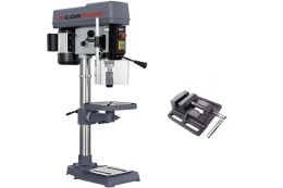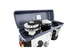 Размер рабочего стола составляет 280×280 мм. Высота стола регулируется с помощью реечной системы, поэтому рабочую поверхность можно быстро адаптировать под особенности задачи. Наклон стола от -45° до +45° позволяет сверление под углом без необходимости изменения настроек заготовки. Также этот сверлильный станок по металлу настольный комплектуется тисками 100 мм и лазерным указателем.