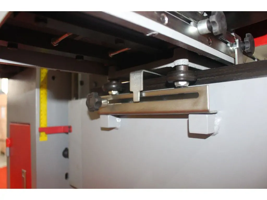 Наклон сверлильной головки на ±45° позволяет делать пазы под углом. Для надежной фиксации заготовки есть 2 эксцентриковых прижима, для повторяющихся операций станок имеет регулируемые упоры. Размер стола составляет 570x300 мм, для обработки больших панелей и длинных деталей опционально доступны удлинители стола. В комплект поставки входит устройство для сверления отверстий под шканты с четырьмя фиксированными позициями (16, 20, 22, 25 мм). Этот горизонтальный пазовальный станок имеет жесткую стальную конструкцию с широким основанием, что гарантирует его стабильность и точность под нагрузкой.