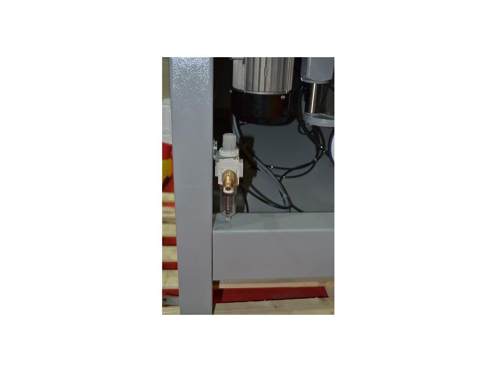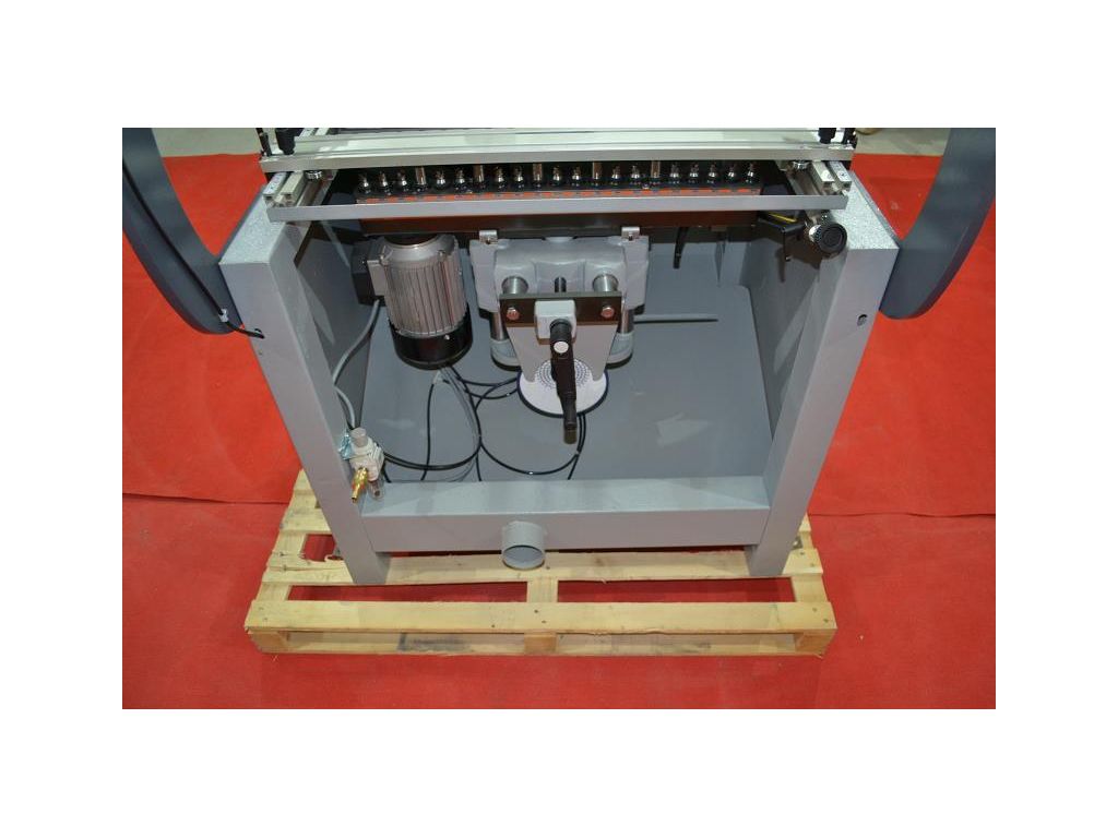 Это стандартный 21 шпиндельный сверлильно-присадочный станок. Расстояние между шпинделями 32 миллиметра, а между первым и последним 640 миллиметров. Вращаются они со скоростью 2850 оборотов в минуту. Пневматическое сверление можно регулировать по скорости, также предусмотрено вращение головки от 90 до 0 градусов.