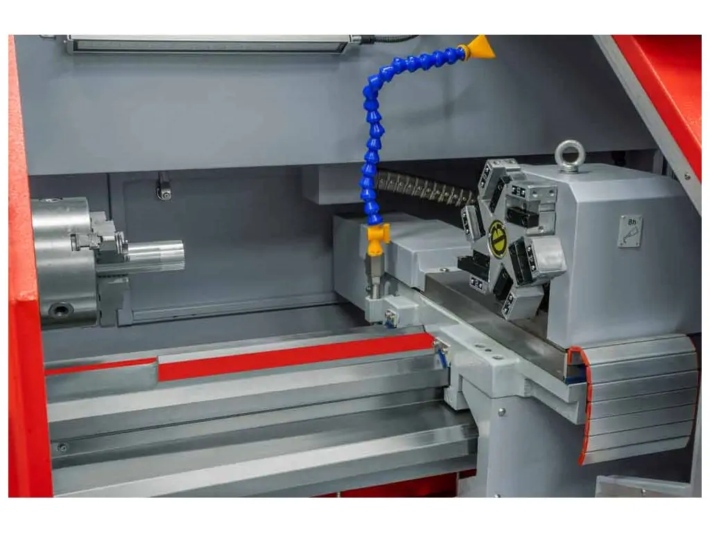 6-позиционный держатель инструмента, двигатель мощностью 3,7 кВт, прецизионный шпиндель на закаленных шарикоподшипниках со скоростью вращения 150-2500 об/мин и 2 скорости подачи, 3 м/мин и 6 м/мин (ось X или Z), обеспечивают высококачественную обработку всех видов металла. Система охлаждения СОЖ предотвращает перегрев и улучшает результат обработки, а центральная система смазки повышает надежность оборудования и уменьшает износ узлов. Массивная, жесткая чугунная станина поддерживает стабильность обработки и ее высокую точность. Этот токарный ЧПУ станок по металлу обладает широкими функциональными возможностями и высокой надежностью, что делает его отличным выбором для вашего производства.