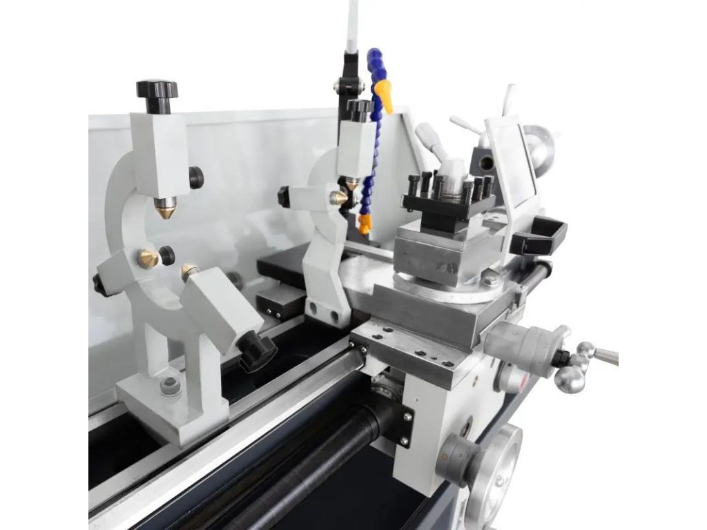 Преимуществами представленной модели являются автоматические продольная и поперечная подачи, простая регулировка скорости шпинделя в диапазоне 25-1600 об/мин, поворот инструментальной каретки на ±45° и механизм скольжения задней бабки на ±10 мм для обработки конусов. Благодаря массивной, устойчивой станине с индукционно закаленной и точно отшлифованной направляющей этот токарный станок по металлу работает практически без вибраций и гарантирует высококачественный результат.