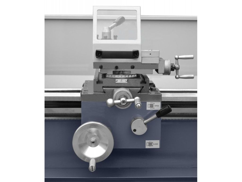 Токарный станок имеет продольную подачу, мощный двигатель 0,75 кВт, 125 мм самоцентрирующийся 3-х кулачковый токарный патрон и дополнительные правые/левые кулачки и неподвижные клыки.