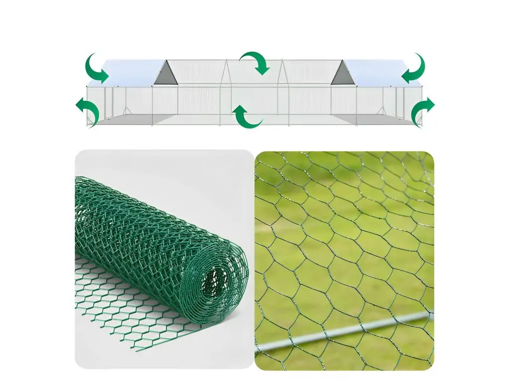 Каркас изготовлен из оцинкованной стальной трубы диаметром 25 мм. Для улучшения устойчивости есть фиксаторы опор к почве. Оцинкованная стальная сетка с ПВХ покрытием и ячейками размером 0,9 мм надежно защищает пернатых от побега и хищников. Комбинированное накрытие, часть которого изготовлена из сетки, а другая часть – из водонепроницаемого, УФ-стойкого материала, защищает птиц от коршунов и других крылатых хищников, а также от осадков и палящего солнца. На нашем сайте вы можете заказать такой или другие вольеры для домашней птицы с быстрой доставкой по Украине.