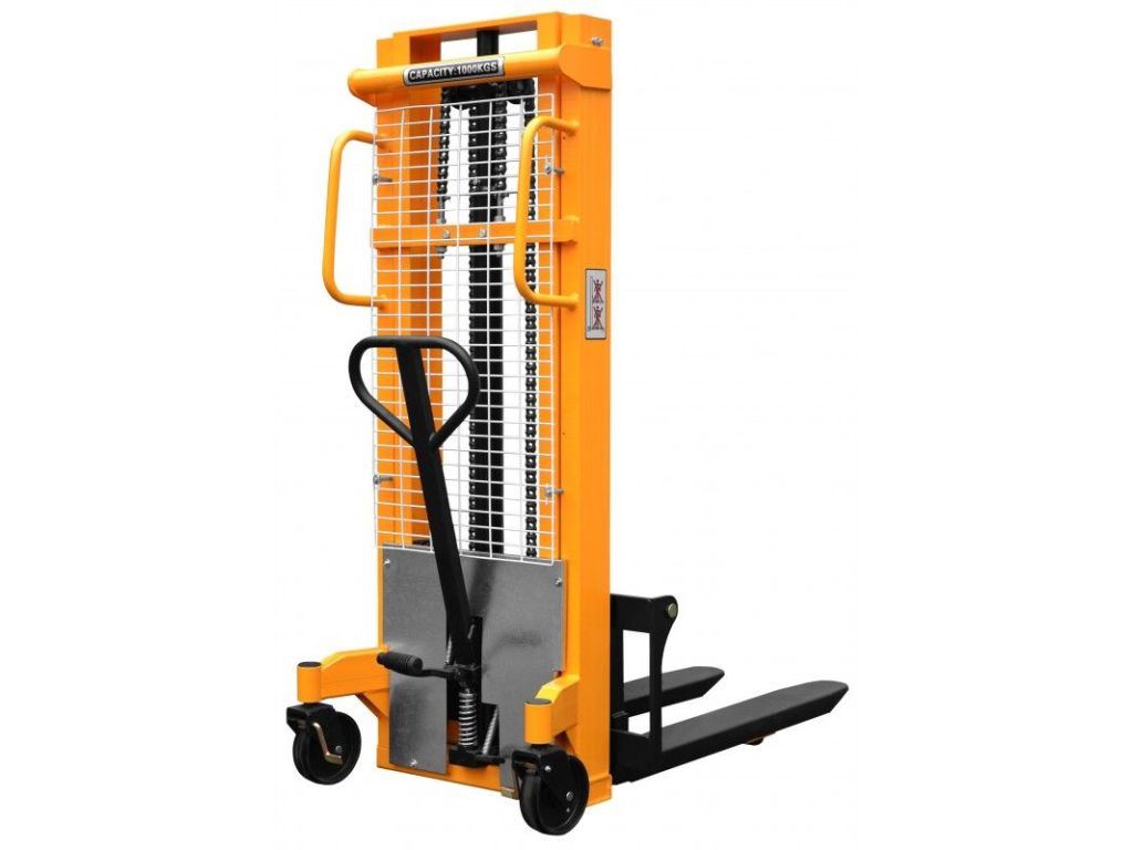 Подъем производится с помощью гидравлического насоса, приводимого в действие рычагом или ножной педалью. Гидравлический клапан обеспечивает плавное опускание груза без рывков. Для защиты от перегрузки есть предохранительный клапан. Усиленная двухсекционная стальная мачта с C-образным профилем устойчива на изгиб и кручение и в сложенном состоянии имеет высоту 1810 мм, что позволяет свободно проезжать через стандартную дверь. Прочная стальная сетка защищает оператора от падения груза. Благодаря небольшой ширине, поворотным полиуретановым колесам, радиусу поворота 1250 мм и эргономичной ручке управления с поворотом до 190° и резиновым покрытием, этот штабелер с подъемом 2,5 м легко управляемый, маневренный и удобный для работы в узких проходах и ограниченном пространстве.