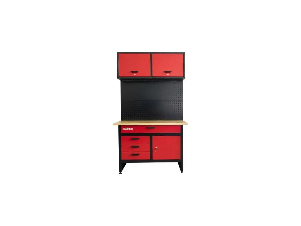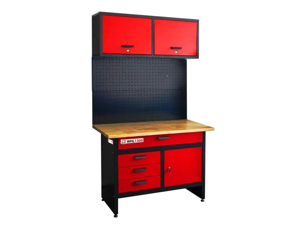 Верстак с настенным шкафом и перфорированной стенкой Holzmann WHL 1200 – это практичное и функциональное оборудование для мастерских всех профилей, которое позволяет создать комфортную рабочую зону и обеспечить удобное хранение инструмента и аксессуаров. Просторная столешница выполнена из каучукового дерева, устойчива к повреждениям и нагрузкам. Настенный шкаф имеет 2 отделения и выдерживает нагрузку до 32 кг. Есть широкий ящик под столом с допустимой нагрузкой 25 кг, 3 ящика слева и большой ящик справа. Все ящики запираются на ключ.