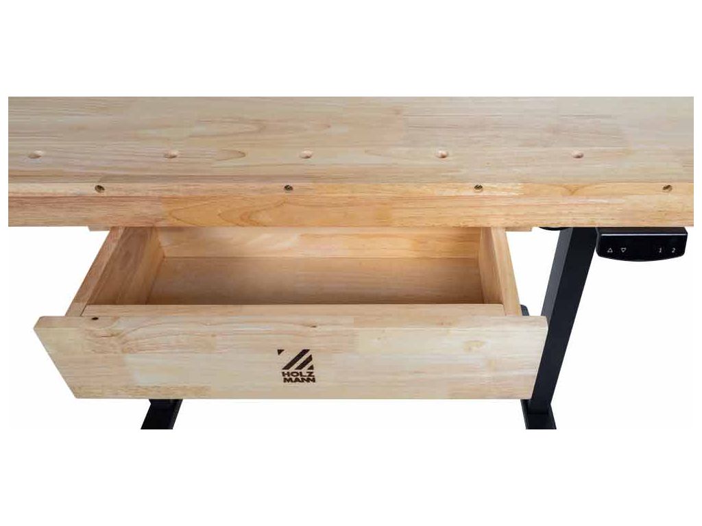 Столярный верстак с электрической регулировкой Holzmann WB150ELIFT_230V идеально дополнит любую деревообрабатывающую мастерскую, ведь обеспечивает высокое удобство и надежность в работе. Столешница изготовлена из прочного каучукового дерева и имеет электрическую регулировку высоты в диапазоне 765-1220 мм, что позволяет адаптировать верстак под свои потребности. Для облегчения настройки есть панель управления с 2 предварительно запрограммированными рабочими положениями. Размер столешницы – 1365х500х18 мм, выдерживает нагрузку до 40 кг.