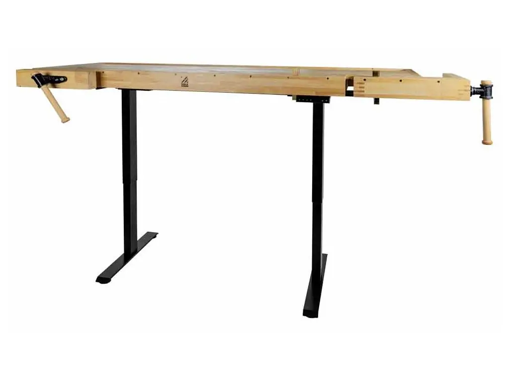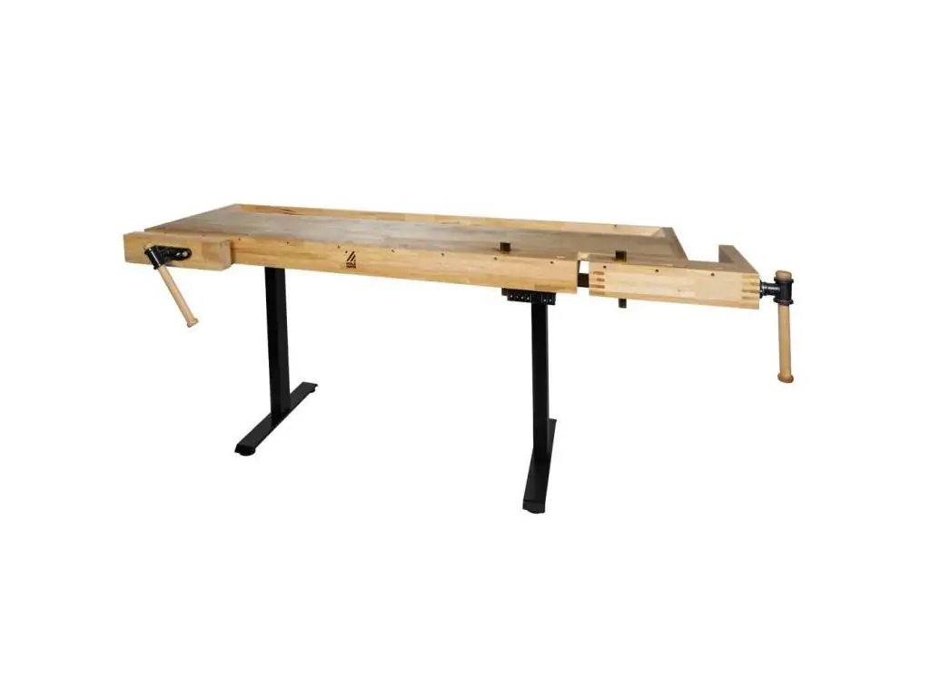 Столешница изготовлена из каучукового дерева, имеет размер 1885х615 мм и толщину 23 мм, что позволяет удобно разместить на рабочей поверхности нужный инструмент. Двое тисков шириной 400 мм с максимальным ходом 125 мм делают верстак еще более функциональным. Есть большой отсек для хранения аксессуаров. Этот верстак с электрической регулировкой соответствует европейским стандартам качества и безопасности, что подтверждает сертификат СЕ.