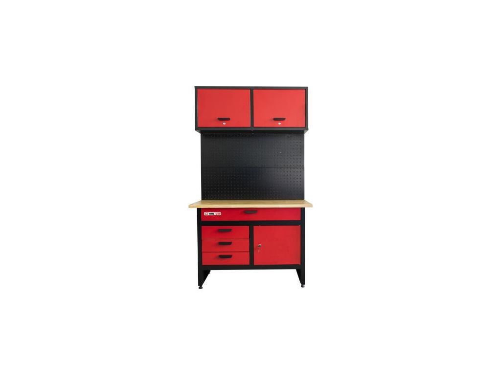 Верстак с настенным шкафом и перфорированной стенкой Holzmann WHL 1200 – это практичное и функциональное оборудование для мастерских всех профилей, которое позволяет создать комфортную рабочую зону и обеспечить удобное хранение инструмента и аксессуаров. Просторная столешница выполнена из каучукового дерева, устойчива к повреждениям и нагрузкам. Настенный шкаф имеет 2 отделения и выдерживает нагрузку до 32 кг. Есть широкий ящик под столом с допустимой нагрузкой 25 кг, 3 ящика слева и большой ящик справа. Все ящики запираются на ключ.