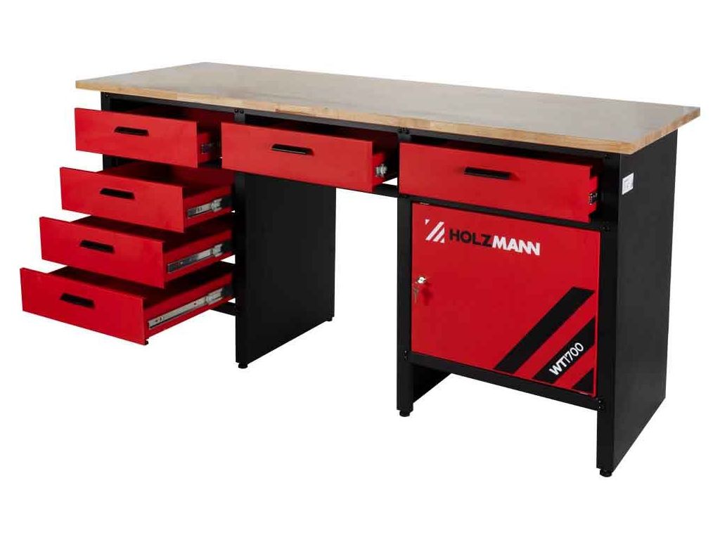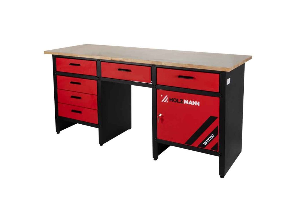 Верстак Holzmann WT1700 – это удобное и функциональное оборудование для организации рабочего пространства вашей мастерской. Оборудован большой столешницей из каучукового дерева толщиной 25 мм, что позволяет работать с разными материалами. Максимальная нагрузка на столешницу – 200 кг, поэтому можно без проблем разместить на рабочей поверхности нужное оборудование и инструмент и работать с массивными заготовками. Высота столешницы составляет 815 мм, что оптимально для комфортной работы.