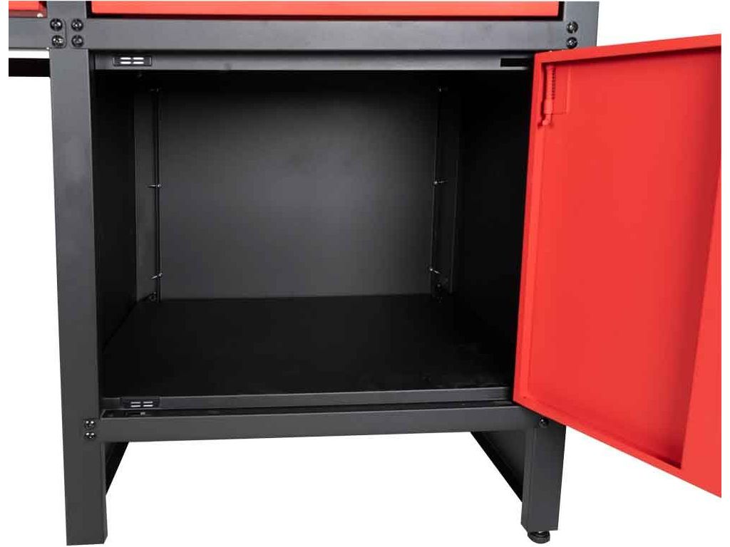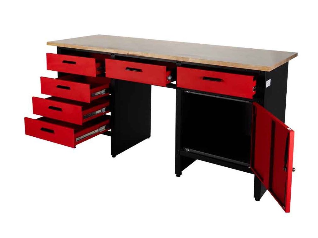 Благодаря регулируемым ножкам верстак легко устанавливается даже на неровных полах. 6 выдвижных ящиков, каждый из которых выдерживает нагрузку до 35 кг, и шкаф на замке размером 564х446х384 мм обеспечивают много места для удобного хранения инструментов и аксессуаров. За счет прочной конструкции из качественных материалов этот верстак для мастерской очень долговечный.