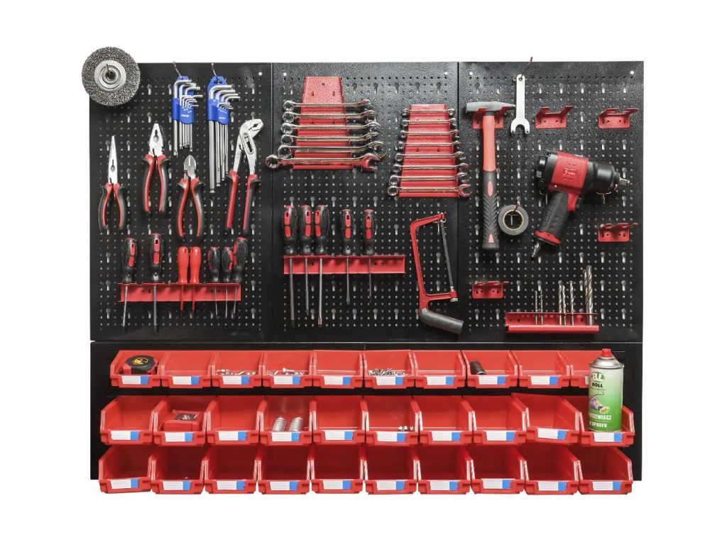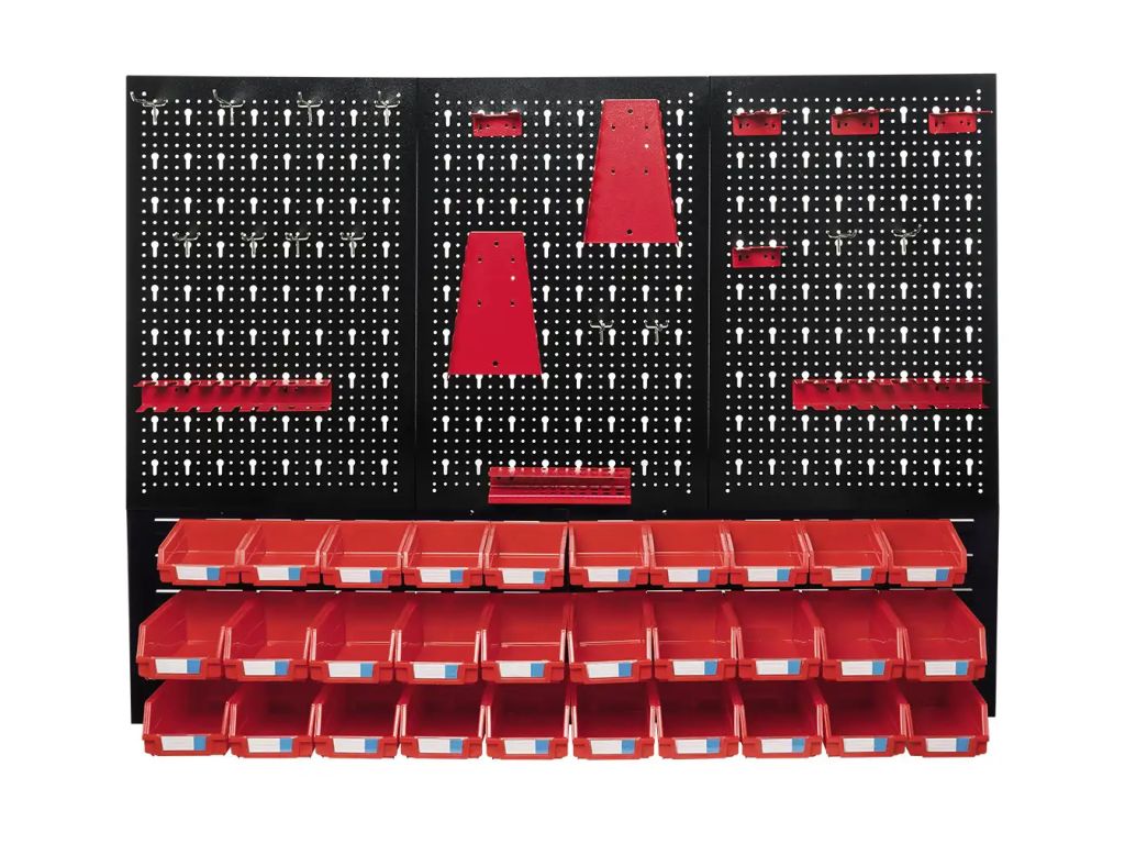 Комплектуется 30 пластиковыми контейнерами со специальными стикерами, поэтому вы можете рассортировать инструмент так, как удобно, и подписать наполнение каждого ящика для быстрого нахождения нужного предмета. 22 металлические вешалки разного размера и формы позволяют компактно закрепить разнообразный инструмент на стеллаже. Благодаря своей универсальности и удобству такая доска для инструмента отлично дополнит как мастерскую, так и собственный гараж.