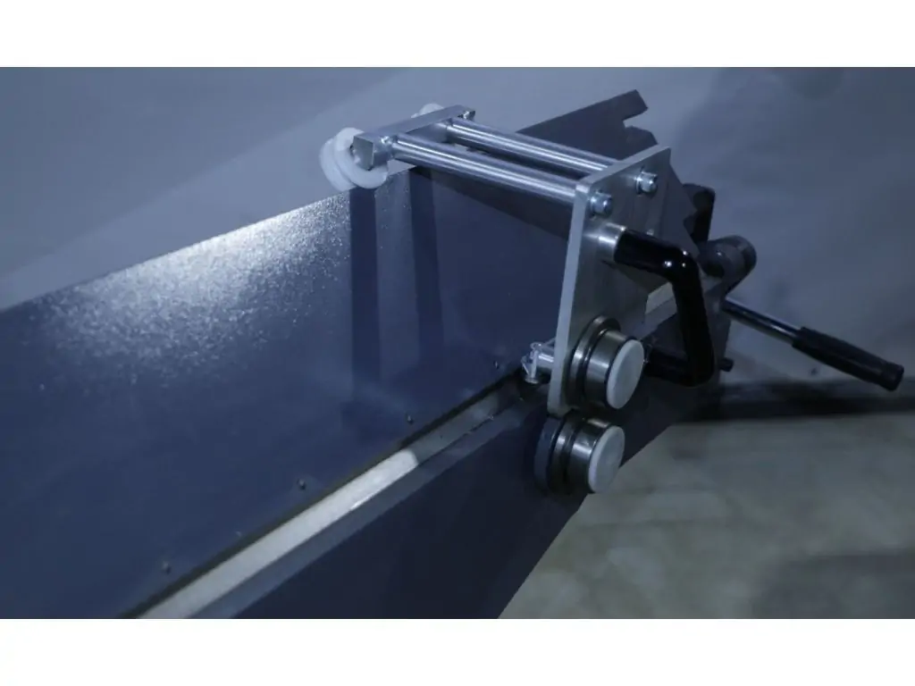 Прижимная балка двигается строго вертикально по направляющим, что обеспечивает однородный прижим по всей поверхности листа. Эксцентриковый механизм с ограничителем позволяет быстро зафиксировать заготовку и закрепить балку в верхнем или нижнем положении. Регулировка хода гибочной балки дает возможность компенсировать пружинение металла и получить точный угол гибки. Благодаря сплошной сварной раме из толстостенной стали этот листогиб с отрезным ножом сохраняет стабильную геометрию и точность в течение всего срока службы.