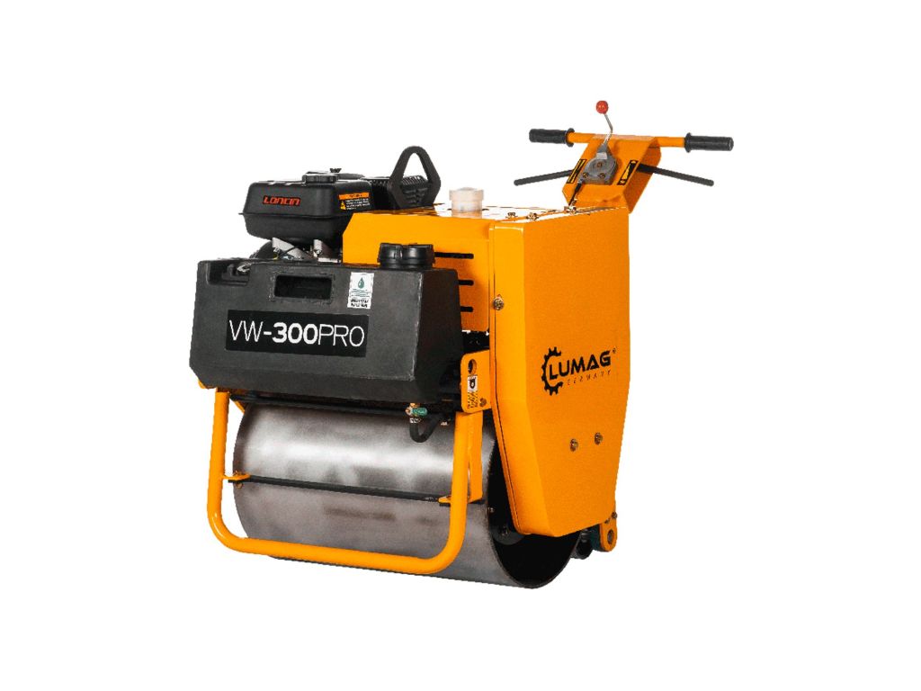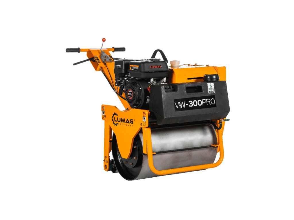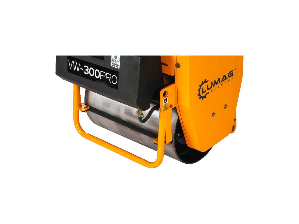 Lumag VW300PRO – виброкаток средней тяжести для использования в строительстве дорожек, садоводстве и ландшафтном дизайне, укладке тротуаров или небольших ремонтных работах в строительстве дорог. Бесступенчатый гидростатический привод обеспечивает скорость до 2,1 км/ч вперед и 1,4 км/ч назад. Виброплита имеет небольшой боковой свес для оптимального уплотнения вплоть до стен или бордюров. Кроме того, есть передние и задние стеклоочистители, а также крепкая защитная рама с центральной одноточечной подвеской и опорами безопасности спереди и сзади. Направляющее дышло можно разместить вертикально для транспортировки, а резервуар для воды вверху обеспечивает постоянное распыление воды во время работы на черной палубе.