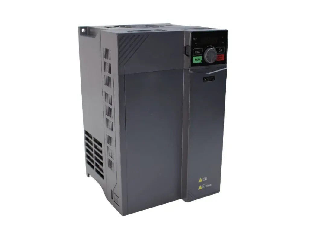 На лицевой части расположена панель управления с дисплеем и кнопками, позволяющая настраивать и отслеживать параметры работы, а также управлять двигателем вручную. Воздушное охлаждение предотвращает перегрев устройства и позволяет его длительное использование. Для отвода тепла на корпусе есть вентиляционные решетки. Такой инвертор для двигателя 20 HP обеспечивает энергоэффективность оборудования и увеличивает его рабочий ресурс, что позволяет оптимизировать производственный процесс и сделать его более эффективным.