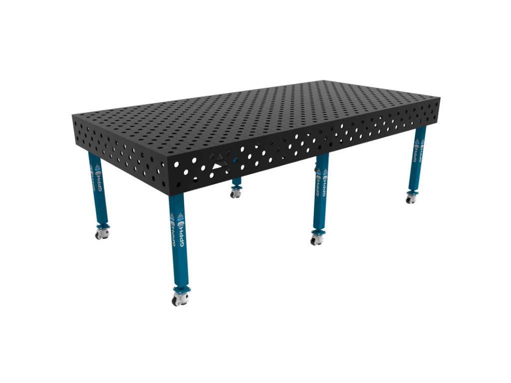 Плотное ребро столешницы и допуск плоскостности ±0,5 мм обеспечивают идеально ровную рабочую поверхность и точное и стабильное основание для деталей. Поверхность оснащена фрезерованными, скошенными отверстиями с допуском размера ±0,1 мм. Гравированная шкала с диагональной сеткой 50х50 мм позволяет точно позиционировать конструкцию, а также подходит для роботизированных сварочных станций. Ножки изготовлены из профиля 60х60 мм, грузоподъемность – 250 кг на ножку. На выбор могут быть ножки с колесами или ступней, поэтому вы можете купить сварочный стол под свои производственные потребности.