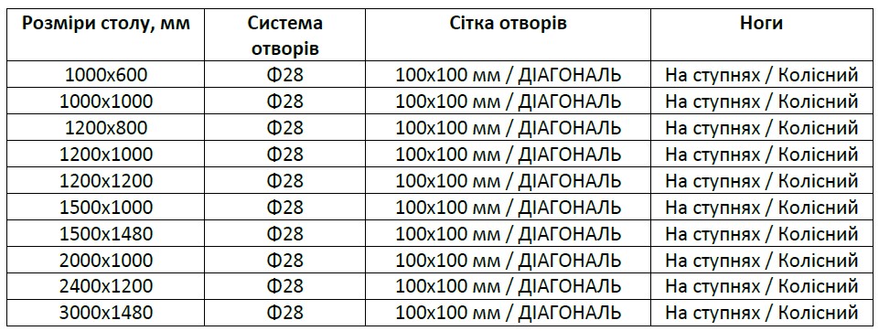 Стол оснащен ножками из профилей 120х120х4 мм, грузоподъемность – 1000 кг на ножку. Фрезерованные, скошенные отверстия в столешнице точно подобраны к инструментам, что сокращает время на их сборку и разборку. Для точного позиционирования конструкции на рабочей поверхности есть гравированная шкала, состоящая из вертикальных и горизонтальных линий в диагональной сетке 100x100 мм. На нашем сайте можно заказать такой сварочный стол для производства нужного размера и с ножками на колесах или со ступней, что позволяет максимально удовлетворить производственные потребности.