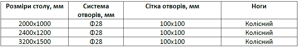 Фрезерованные, скошенные отверстия диаметром 28 мм в сетке 100х100 мм позволяют легко закрепить инструмент. Также можно увеличить количество точек крепления инструментов в промежутках между плитами столешницы. Высоту стола можно регулировать в диапазоне 850-1150 мм. Такой стол для сварки модульный имеет ножки на колесах и грузоподъемность 250 кг/ножка.