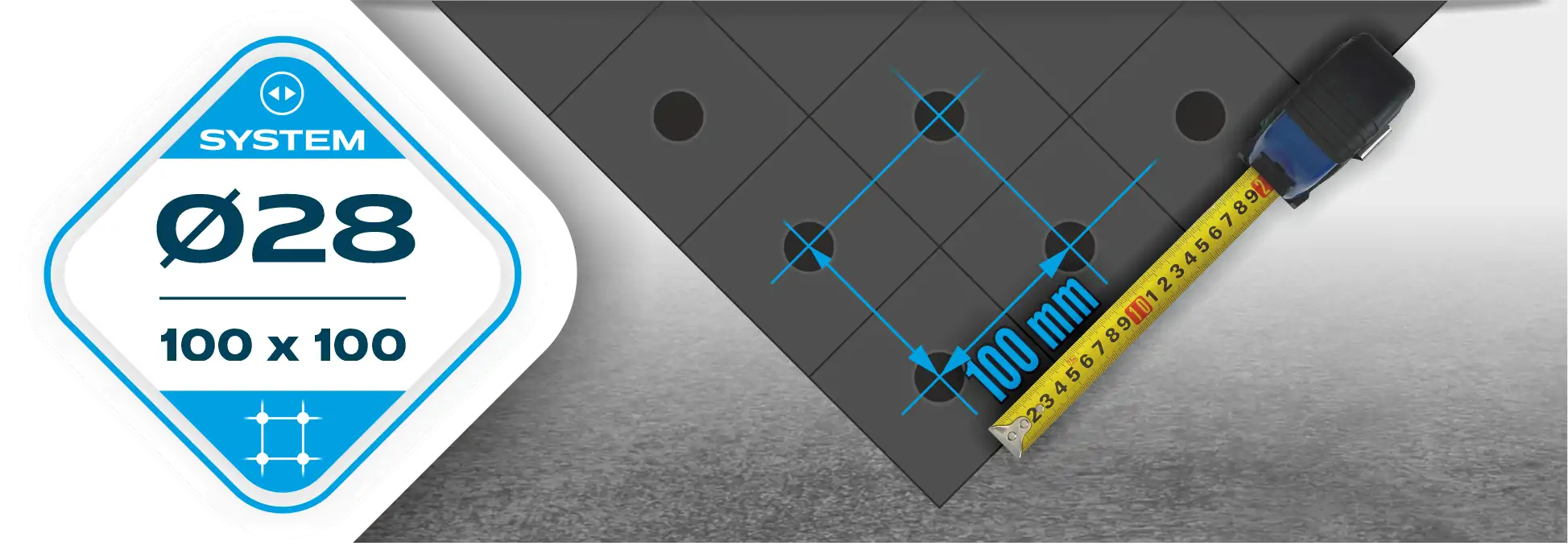 Фрезерованные, скошенные отверстия диаметром 28 мм позволяют быстро и надежно закрепить разнообразный инструмент, а сетка 100х100 мм - точно позиционировать заготовку. За счет ножек на колесах этот сварочный стол с расширением можно легко переместить в нужное место.