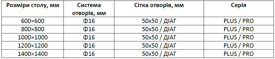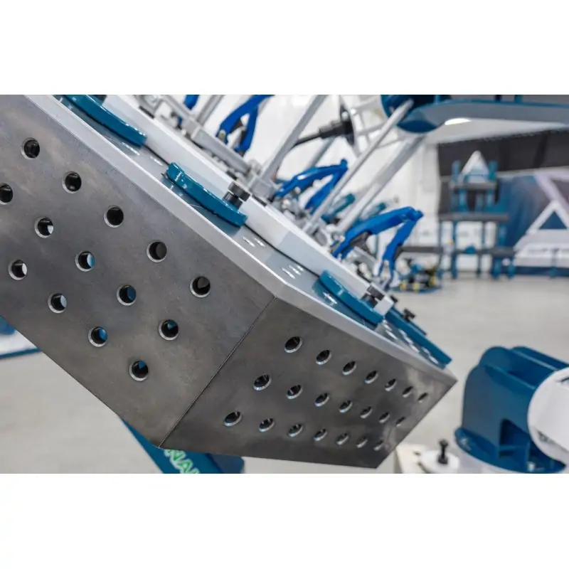 Толщина столешницы - 12 мм (PLUS, PLUS INOX) или 15 мм (PRO, PRO INOX). Допуск плоскостности ±0,3 мм гарантирует идеальную ровность и стабильность поверхности даже при высоких нагрузках. Фрезерованные, фаскованные отверстия с допуском ±0,5 мм обеспечивают точную и надежную фиксацию инструментов. Диаметр отверстий - 16 мм. Три ряда отверстий в боковых панелях позволяют фиксировать детали в вертикальной плоскости. Такой сварочный стол для роботов может использоваться и для ручной сварки, обеспечивая удобство и высокую точность работы.