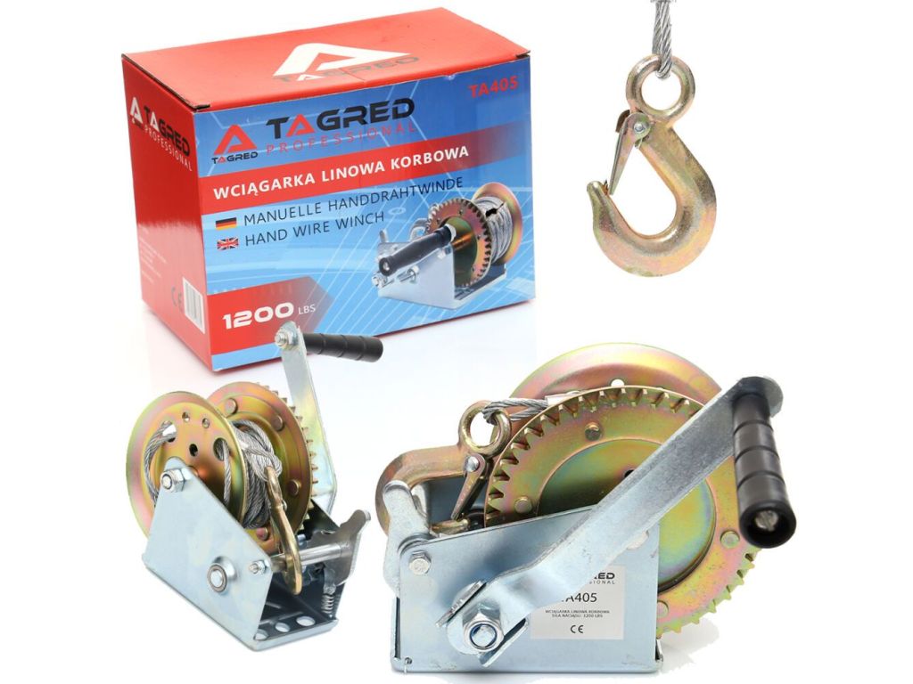 Кривошипна лебідка TAGRED TA405 -  виготовлена з високоякісної конструкційної сталі. Литий гак має поворотну пружину. Для керування пристроєм використовується ручна рукоятка, а також храповий механізм для втягування та витягування предметів. Ідеальне обладнання для витягування, зв'язування, закріплення та перетягування важких і великих предметів. Має блокувальний гак та запобіжник з храповою пружиною із загартованої сталі.