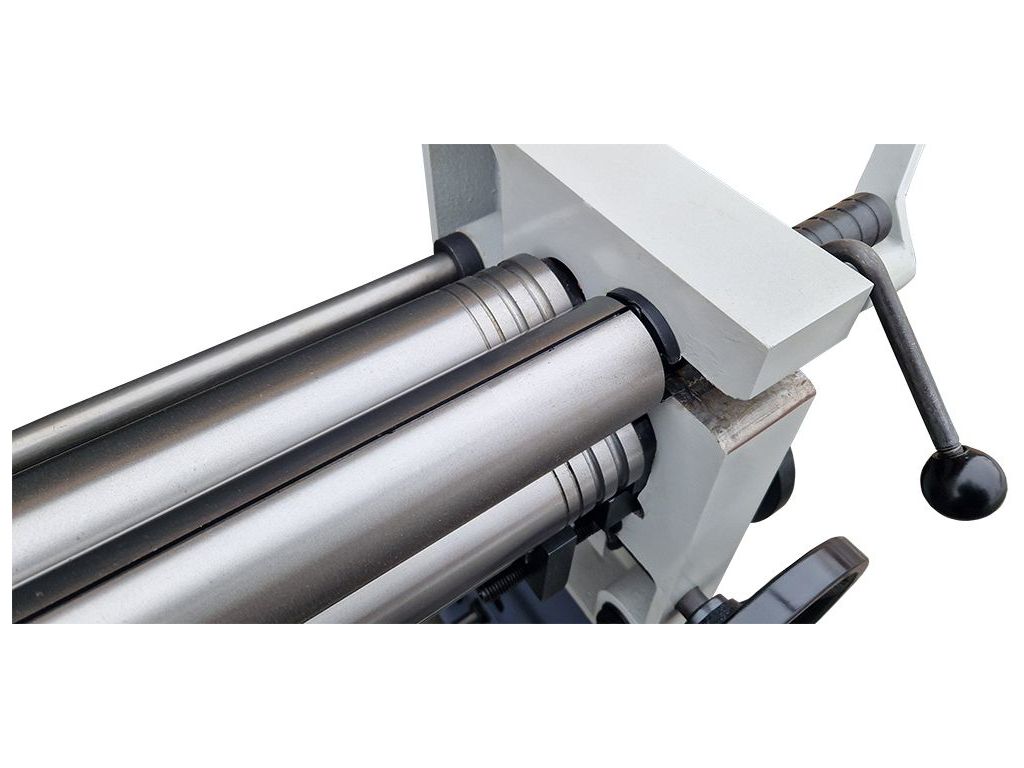 Гладкі, поліровані вали не пошкоджують поверхню заготовок. На поверхні валів є канавки для згинання прутів. Швидкознімний відкидний верхній вал дозволяє легко зняти готовий виріб. Жорстка конструкція з високоякісної сталі вагою 240 кг ефективно поглинає вібрації і забезпечує стабільність роботи навіть при обробці твердих металів. Точність і надійність у роботі роблять цей вальцювальний верстат відмінним вибором для професійних індивідуальних і дрібносерійних виробництв, які спеціалізуються на виготовленні повітроводів та водостоків з оцинкованої сталі, і не тільки.