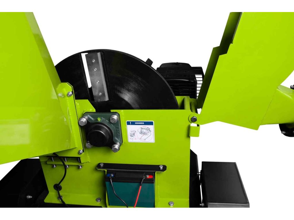 Бензиновий двигун потужністю 9 кВт і дискова система подрібнення з швидкістю обертання лез 2000 об/хв забезпечують високопродуктивну роботу і дозволяють за короткий час переробити значну кількість деревини.Також двигун даної моделі облаштований електростартером для комфортного заведення. Подрібнювач має зручний бункер для завантаження матеріалу. Перероблений матеріал викидається під тиском. Лопатки на задній частині маховика забезпечують викид на велику відстань, завдяки чому робоча зона залишається чистою. Корпус виготовлений з високоякісної сталі, що гарантує тривалий термін служби. 2 великих колеса і фаркоп забезпечують легке транспортування подрібнювача на всіх поверхнях.
