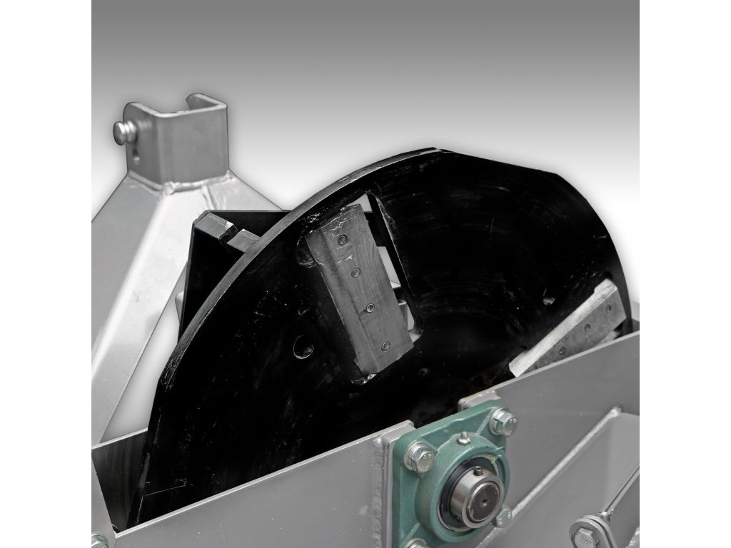 Агрегат сконструйований таким чином, щоб його було зручно обслуговувати: ви можете повністю відкрити кришку маховика, відкрутивши лише один гвинт, що відкриває доступ до 4 ріжучих ножів. Ці ріжучі леза двосторонні, так що їх можна повертати, якщо потрібно. Маховик має вагу нетто 50 кг і оснащений крилами, які створюють неймовірно потужне всмоктування, що в кінцевому підсумку виштовхує стружку з жолоба. Завдяки такому потужному всмоктуванню блокування подрібнювального пристрою практично неможливе.