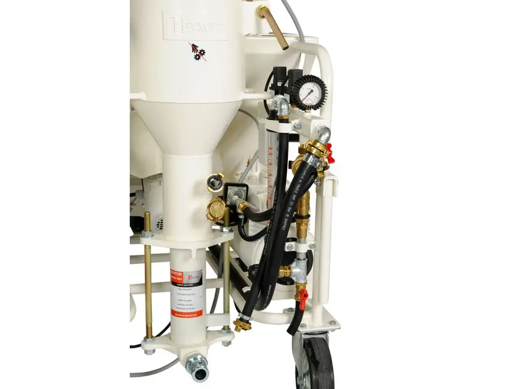 Штукатурна станція має вбудовану водопровідну арматуру з витратоміром, який точно вимірює потік води. Потрібний потік виставляється оператором. Вбудована водяна помпа забезпечує стабільний тиск води незалежно від тиску в зовнішньому водопроводі. Це гарантує, що співвідношення сухої суміші та води залишається постійним, забезпечуючи ідеальну консистенцію розчину.