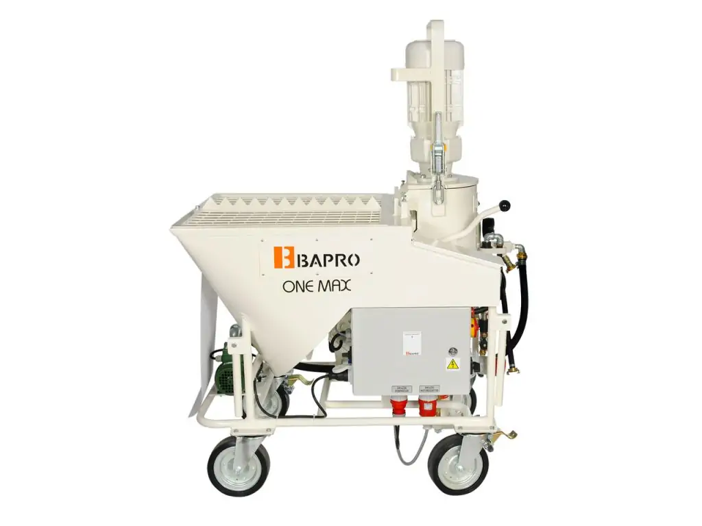 Штукатурна станція BAPRO one PLUS - це професійне, високопродуктивне обладнання для автоматичного змішування і нанесення будівельних розчинів (гіпсові, цементно-вапняні, декоративні, фасадні штукатурки), призначене для використання на великих будівельних об’єктах. Особливістю моделі є посилений редуктор, а також посилений приводний вал та підшипники, що дозволяє працювати з більш абразивними та важкими розчинами.