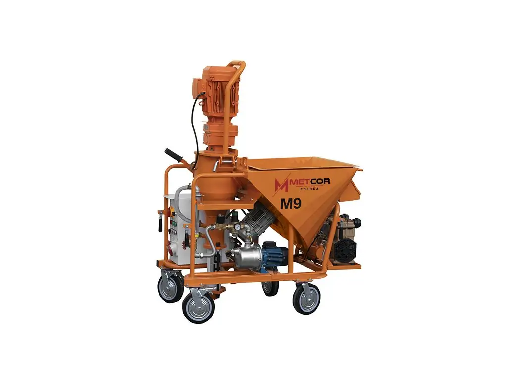Штукатурна станція METCOR M9 - це професійне обладнання для автоматичного приготування, подачі і розпилювання на поверхні гіпсових і цементно-вапняних штукатурок, клейових сумішей, самовирівнювальних стяжок і подібних будівельних розчинів. Трифазний електродвигун потужністю 5,5 кВт стійкий до перегріву і забезпечує рівномірне перемішування важких розчинів і їх безперервну подачу до сопла. Для подачі готового розчину використовується компресор потужністю 1 кВт. Продуктивність станції становить 30 л/хв при максимальному тиску 30 Бар. Максимальна відстань подачі - 30 м по горизонталі та 20 м по вертикалі.